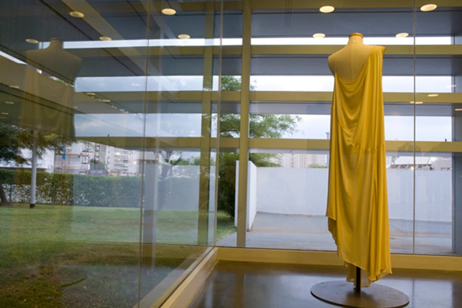 הגלריה התחתונה - פרט, אביב/קיץ 1997, שמלת משי צהובה בגזרת סטרפלס, צילום: שרון דרעי