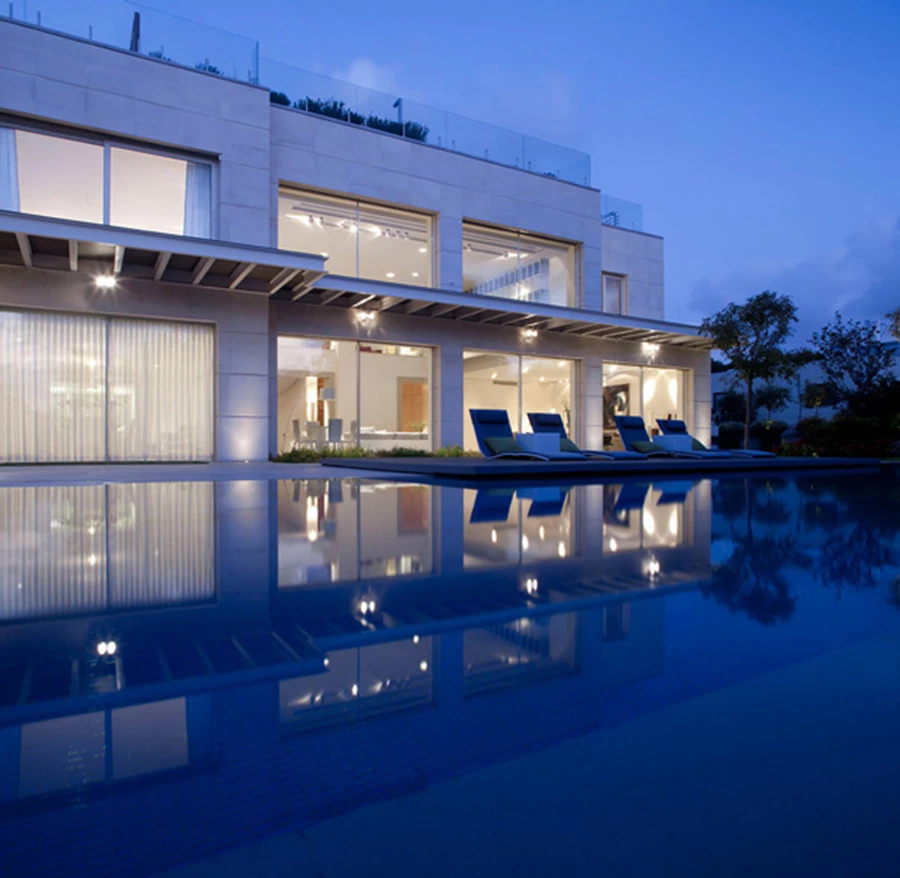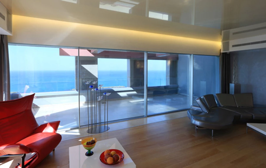 מפתח גדול במיווחד שאורכו 17.5 מ'. הדלתות נאספות לתוך כיס כך שפרופילי האלומיניום נעלמים ומותירים רק שקיפות. תכנון אדריכלי: 'פיצו קדם אדריכלים'. צוות תכנון: אדר' פיצו קדם. אדר' נועה גרומן. ביצוע: גבי שיר. צילום: עמית גירון פרופיל של פתח