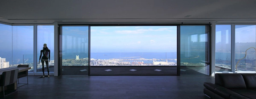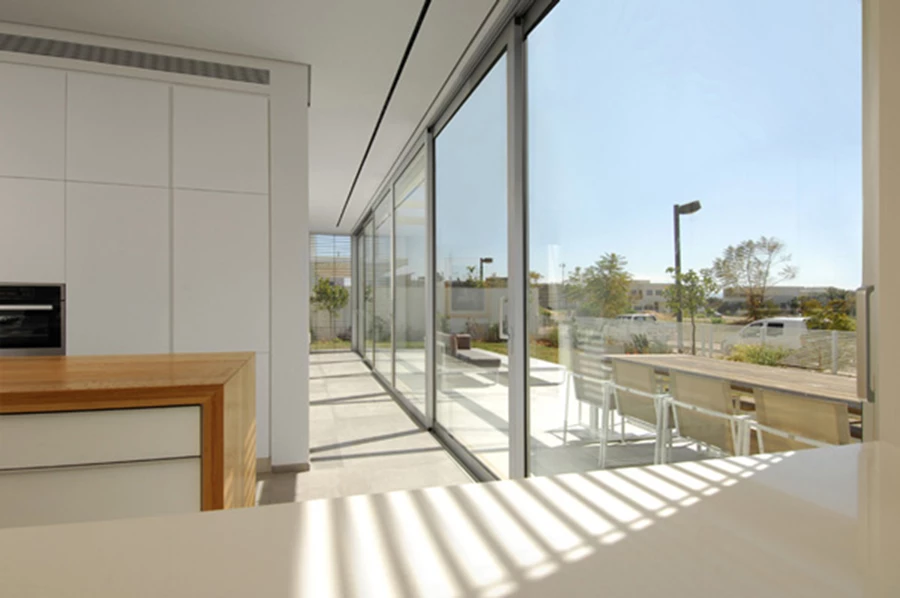 מפתח פינתי העושה שימוש בפרופיל ייעודי ומאפשר פתיחה מלאה של שתי כנפי הזיגוג. תכנון אדריכלי: 'אקר-מיכאל אדריכלים'. ביצוע: 'פרפקט' צילום: עוזי פורת.