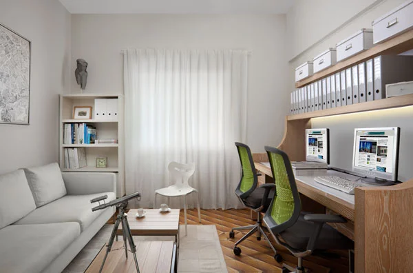 במעבר חד מרוח החלל: עיצוב ענייני ועכשווי בחדר המשמש כמשרד.