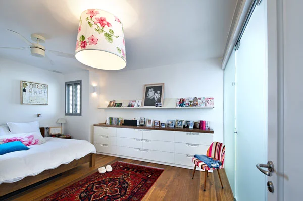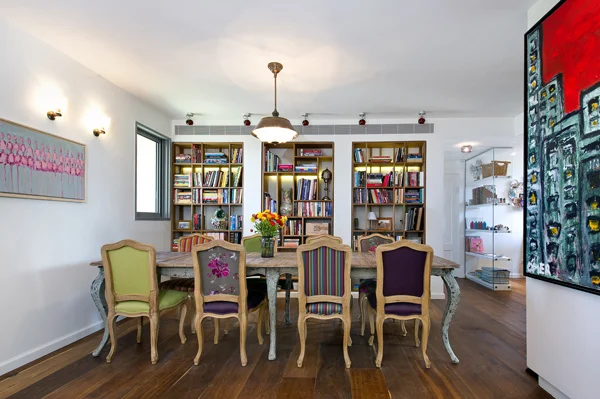 פינת האוכל: כיסאות מרופדים בבדים שונים מייצרים מראה צבעוני וייחודי, ומאחוריה ממוקמת ספרייה- שלוש יחידות מדפים זהות שהוצבו לאורך הקיר, ועיבוי המרווחים ביניהם בגבס תוך יצירת מעין גומחות. "הרבה אלמנטים בדירה הם, למעשה, פתרונות שנהגו על מנת להתגבר על אילוצים, או כאלה שנרקמו תוך כדי התהליך" אומרת ברנח, ו"ספריית הגומחות" המיוחדת שמכסה את פני שטחו של הקיר מאחורי פינת האוכל היא דוגמה לכך "הכוונה הייתה לשלב בו יחידת ספרייה גדולה בעבודת נגרות, אבל שרי נתקלה בשלוש יחידות מדפים זהות שמצאו חן בעיניה לצורך זה. הצבנו אותן לאורכו ואת המרווחים ביניהן עיבינו בגבס שיצר מעין גומחות המכילות אותן". אלמנט מעניין אחר הוא האופן בו נתחם משרדה של שרי, הממוקם "בדרך" לסוויטת ההורים, אך עדיין נצפה מהמרחב המשותף ונוכח בו: על פתחו סוגרות שתי יחידות זכוכית שקופות שבתוכן מותקנים מדפי MDF המאכלסים פריטי נוי בעלי ייחוד מלבב ששרי מלקטת או יוצרת בעצמה, והמראה המתקבל הוא כשל קופסת זכוכית מסקרנת המשתלבת בחלל. ככלל, אופן פרישתו של החלל מזמן מבטים מגוונים ומשתנים, ועיצובו האקלקטי לוקח מכל העולמות, צבעוני וגדוש בפרטים, אך לא עמוס- פריטי ריהוט מיוחדים שנבחרו בקפידה, פריטי טקסטיל וכריות בשלל צבעים ודיגומים שלכאורה לא משתלבים זה עם זה אך כאן מייצרים הרמוניה, ובכלל זה ריפודים לא אחידים בכיסאות פינת האוכל, שטיחים אתניים, יצירות פסיפס וטקסטיל מעשה ידיה של שרי, גופי תאורה ברוח וינטג' לצד יצירות אמנות מודרניות שמעטרות את הקירות, וניחוח של "סבתא שיק" ששזור מעודנות בכל.