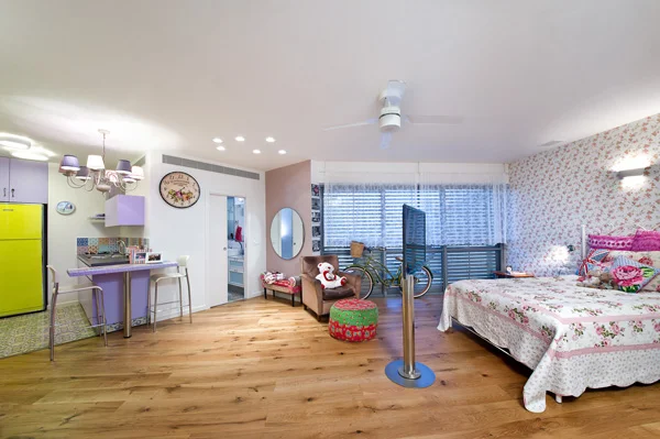 צבע ורומנטיקה בחדרה של הבת: חלל לופטי המעוצב כדירה בזעיר אנפין. כולל אזור שינה עם מיטת "נסיכות", טפט בדיגום שושנים, פינת לימוד, חדר רחצה ופינת מטבחון בצבעוניות מלבבת. מתוך 'באה מאהבה'. גליון 124, מאי - יוני 2012