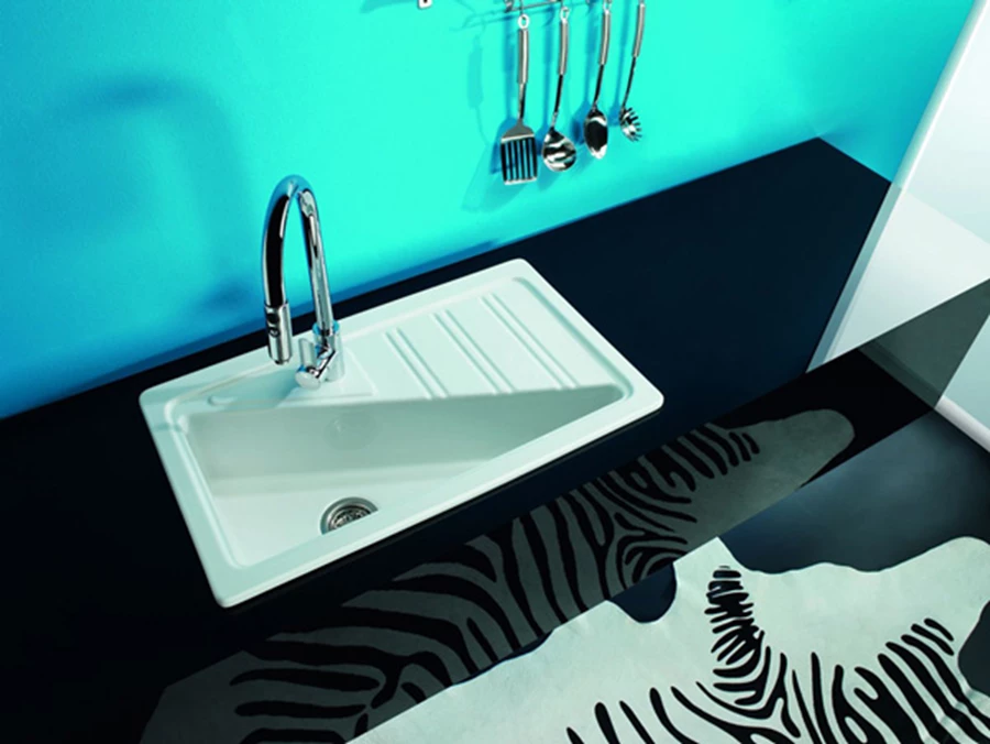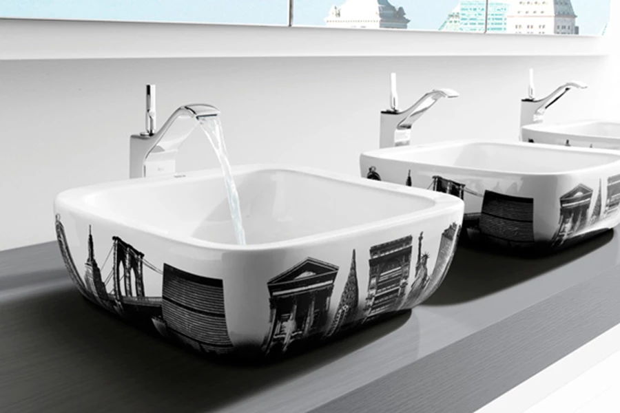 כיור מונח, של מותג 'רוקה', הכולל איור אורבאני. רשת 'אלוני'. צבעוניות