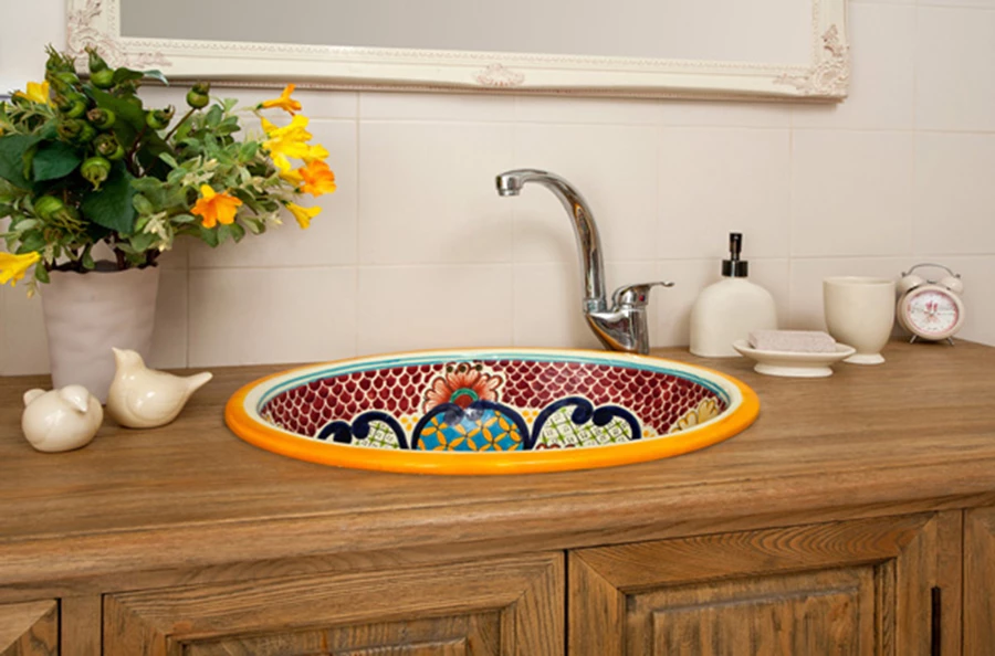 כיור חרס שקוע במשטח, מצויר בעבודת יד. 'טורקיז HOUSE'.