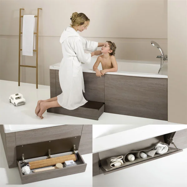 מערכת מגירות נסתרת משולבת עם אמבטיה של המותג 'Jacob Delafon'. 'רשת חרש'.