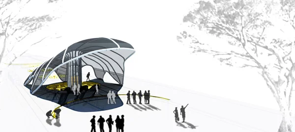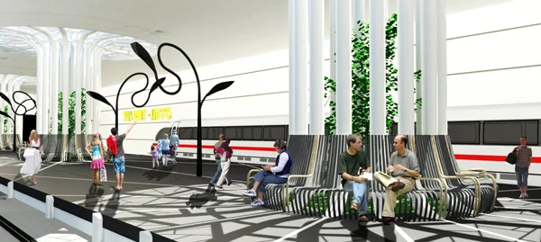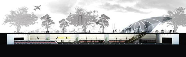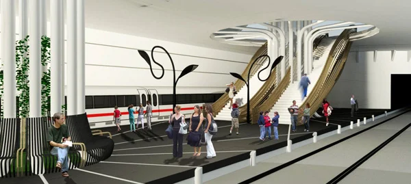 חתך פרספקטיבי בחלל התחנה אתר ההנצחה יד קנדי שבהרי ירושלים שימש השראה למשחקי האור והצל ברציף ושורשי הבטון שלו הם שורשי צינורות הפלדה שפורסים את שלוחותיהם בריצוף הרציף וכדימוי לשורשיו של עץ הפיקוס.