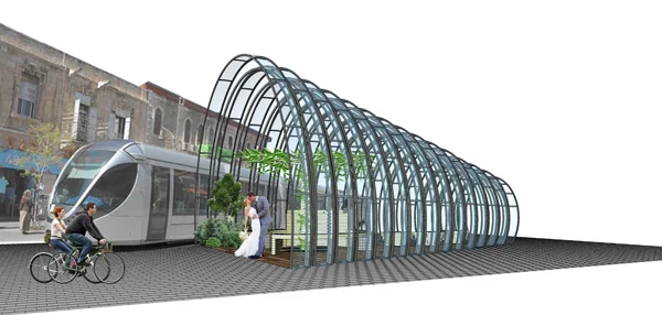מבט אל צורתו החיצונית של המבנה, דמוי קונכייה. מסקנות אלו שימשו אותנו כבסיס לתכנון הרעיוני עיצובי של איזור ההמתנה. תכננו מבנה ששטחו 45 מ"ר, בנוי מפלטות זכוכית ממוחזרת אשר נתמכות ע"י קונסטרוקציית פלדה. חלוקת המבנה מזכירה בצורתה את הקונכייה המגדלית. הכניסה למבנה אפשרית משני צדדיו והנוסעים מוזמנים להמתין לרכבת בישיבה על ספסלי הבמבוקים ולגימת שתייה חמה/קרה בעמדת הבר.