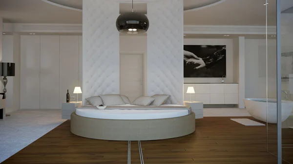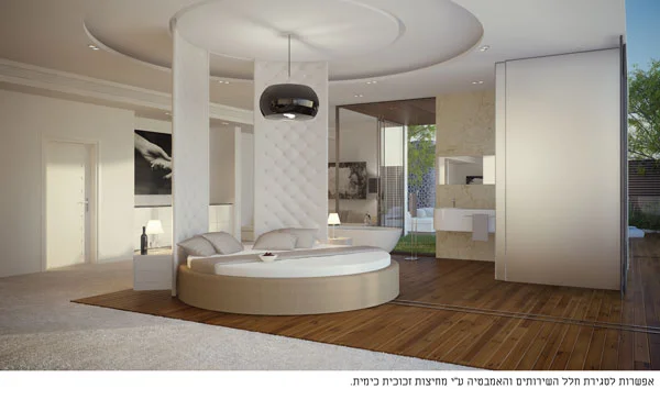 תהליך התכנון החל ברעיון "לנתק" את המיטה מהקיר ולהציבה בחלל באופן חופשי, כזה שמייצר ספקטרום רחב של אפשרויות. בהיקף המיטה מותקנים שני פנלים המשמשים לה גב. הפנלים נעים בחופשיות ב-360 מעלות סביב מסילה עגולה בתקרה, באופן המאפשר לפנות לכל כיוון נבחר (המרפסת, קיר הפלזמה, הכניסה לחדר, חדר האירוח, הפטיו, חדר האמבטיה). בלחיצת כפתור אף המיטה עצמה נעה על גבי מסילה שקועה ברצפה לאורך החדר והמרפסת המערבית, ובכך מאפשרת "לטייל" עמה באוויר הפתוח מתחת לכיפת השמים ועם מבט לנוף בכל רגע נתון, תוך יצירת חוויה חושית מעולם אחר. על מנת להעצים ולהקצין את החוויה, יכולה אף הסוויטה כולה לנוע על גבי מסילות 5.5 מטר קדימה מעבר לחזית המבנה- סיטואציה המאפשרת "לרחף" באוויר ולהרגיש "על גג העולם".