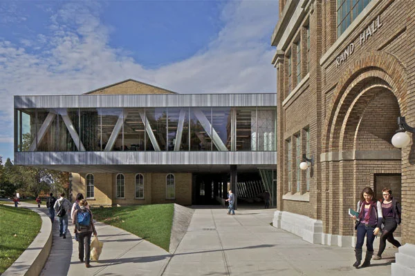 מבט אל רחוב האוניברסיטה ממנו ניתן לצפות במתרחש פנימההיות והקומה השנייה המורמת מן הקרקע מקרה שטח חיצוני רב מאוד, חופתה הדופן התחתונה של כלל הקומה בלוחות ריבועיים ממתכת לבנה עם דיגום של תקרה בסגנון ויקטוריאני, המעניקים גימור עשיר לקירוי ואופי של חלל פנים החובר לסגנון המבנים ההיסטוריים הסובבים אותו. ככלל, החיבור בין ישן וחדש מהווה מופת לתכנון איכותי ויצירת סביבה רבת השראה לאוכלוסיית הסטודנטים לאדריכלות בראשית דרכם- המבנה החדש נמנע מלהיות ראוותני או מנקר עיניים, אינו מתחרה בהדרם של המבנים ההיסטוריים הסמוכים, אלא משלים את סגנונם כלפי חוץ, מקשר ביניהם ומעניק מענה פונקציונאלי המשפר את תפקוד כלל הפקולטה.