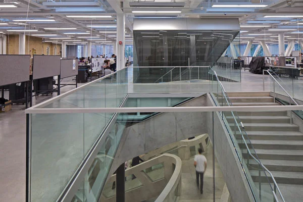 הקומה השנייה המשמשת לחלל הסטודיו לעבודת הסטודנטים הקומה השנייה של המבנה ((The Upper Plate מיועדת לחללי סטודיו לעבודת הסטודנטים, והיא מאכלסת אינספור עמדות העבודה הממוקמות במרווחים קבועים בין אחת לשנייה וממלאות את שטחה. חלל קופסתי זה נתמך על ידי מערכת של מסבכי פלדה (1200 טון!) המונחת על עמודים תוך יצירת חלל גדול ללא מחיצות, גמיש ורב שימושי. החלל רחב הידיים מקרה הן את קומת הקרקע והן את הרחוב החיצוני, ובכך מרחיב את ההזדמנות לשימוש בשטח הבנוי גם כלפי חוץ. קומת הקרקע מתחתיו נחלקת לשטח פנימי ולשטח חיצוני המשמש כמעבר מקורה להולכי רגל. מעבר זה חוצה את שטח הפקולטה, ואגב כך נוצרים המשכיות וקשר לשבילים להולכי הרגל העושים את דרכם מהכניסה הצפונית אל תוככי הקמפוס דרך הפקולטה. מסלול ההליכה עובר לאורכה של חזית הלבנים של בניין סיבלי שהפך לדופן הפנימית של הקומה השנייה, כשהוא חושף את הפעילות הרוחשת בתוכו 24 שעות ביממה.