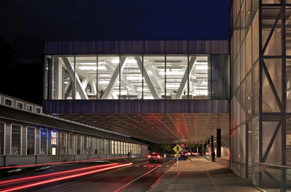 מבט אל המעבר המקורה החוצר את הפקולטה הקומה התת-קרקעית אשר נחפרה בעומק המגרש כוללת את האודיטוריום וחללים רב תכליתיים המשמשים לביקורות הסטודנטים. יצירתה הייתה כרוכה בקידוח עמוק וזהיר במיוחד, למציאת בסיס סלעי שיתמוך כראוי במבנה המשתלב עם ביסוס המבנים הקיימים מסביב.