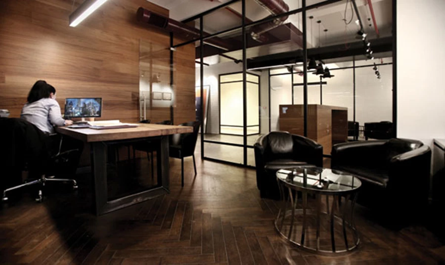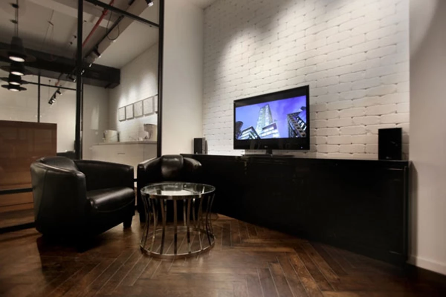 המחיצה האטומה משרתת ממד פרקטי, כשהיא מקנה פרטיות כלשהי ומספקת "תשתית" נוחה לתליית מסך טלוויזיה שנדרש לעתים בישיבות, ובמקביל, בנוכחותה השונה מנופו השקוף של המרחב יוצקת לתוכו עניין ויזואלי נוסף. אלמנט פרקטי אחר שנרתם לטובת העיצוב הוא מעין אדן פנימי רחב עשוי עץ צבוע שחור שתוכנן למרגלות הויטרינות התוחמות את החלל כפתרון להצנעת חיווט ואלמנטים "לא אטרקטיביים", כאשר בה בעת הוא משמש כמדף להנחת ספרים, פריטי נוי וכד'. "חשוב היה לי להכניס את האנשים לאווירה" אומרת ראובני, אשר את האזורים השונים עיצבה כחללים ביתיים, על כל הקפידה המשתמעת מכך, ובקו אקלקטי מסוגנן. פינת ההמתנה למשל, מזכירה בחזותה סלון לכל דבר, ומשלבת ספת שזלונג עכשווית, שולחן קפה מנירוסטה, שטיח בדיגום המדמה פיקסלים, שתי כורסאות עור בעיצוב קלאסי, ואפילו כריות המשלימות את התחושה הביתית.