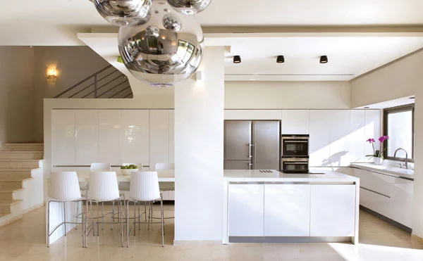 יחידת האי עשויה קוריאן וחזיתות הארונות בגימור ניולק, המעניק ברק ומבטיח עמידות בפני לחות ואמנם, החלל המואר והאוורירי שהתקבל לאחר הסרת הקיר אינו מזכיר כהוא זה את הגיבוב של טרום השיפוץ, ומתגלה כמרחב אסתטי המייצר "שקט בעיניים", נחלק לאזורים מוגדרים ובה בעת משמר זרימה פתוחה. האזור המגלם את השינוי באורח הדומיננטי ביותר, הוא המטבח, אשר מתצורת ר' סטנדרטית שאפיינה אותו הפך לחלל אורכי, ששינה את הכיווניות של כלל הבית, הגדיל באורח משמעותי את הסלון ואף הותיר די מרחב למיקום פינת אוכל נעימה. תכנונו נשען על יחידת אי ארוכה במיוחד- 4.25 מ'- ועל מערך ארונות גבוהים המכסה את כל שטחו של הקיר מולה, כאשר המרווח המשתרע ביניהם הוא רחב יחסית ומאפשר התנהלות נוחה.