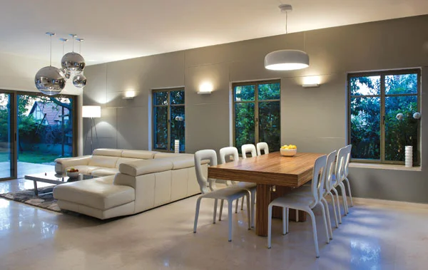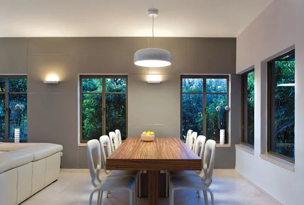 הסלון מעברה השני של יחידת האי ממוקמים אזורי הסלון ופינת האוכל, המשמרים קשר עין ישיר עם המטבח ונהנים מהמרחב החדש שנפתח בפניהם: באזור הסלון הוצבה ספה פינתית מודרנית בעלת ממדים נדיבים, ואזור פינת האוכל עטוף בפתחים הפונים אל הגן ואל הפטיו ואת השולחן שהוצב בו ניתן להגדיל בעת אירוח רב משתתפים ללא כל חשש של היעדר מקום.