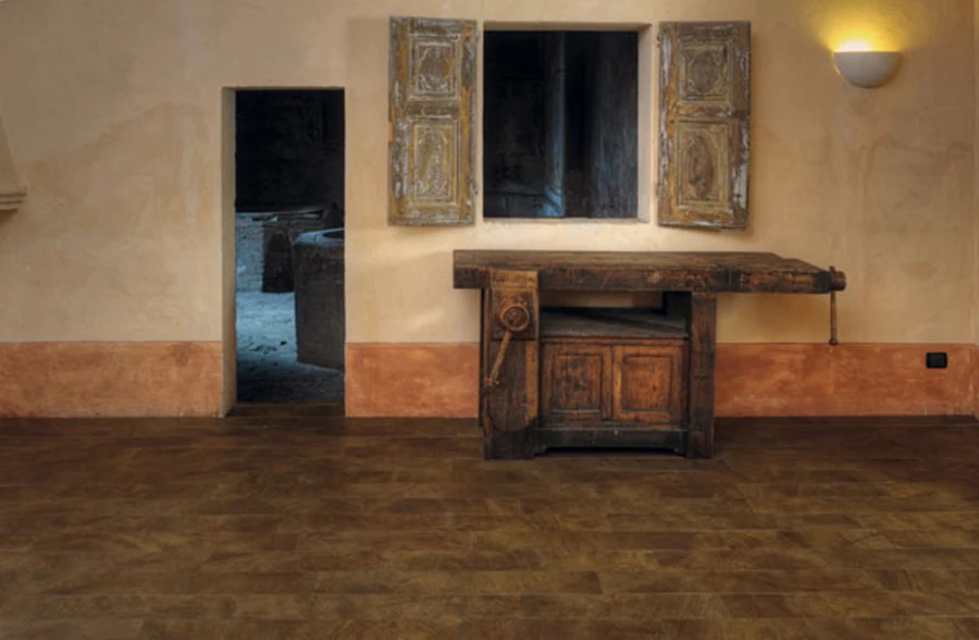 אריחי גרניט פורצלן המדמים מראה של לוחות שפורקו מארגזים, כולל הכיתובים המאפיינים ארגזים כאלה. "ויה ארקדיה".