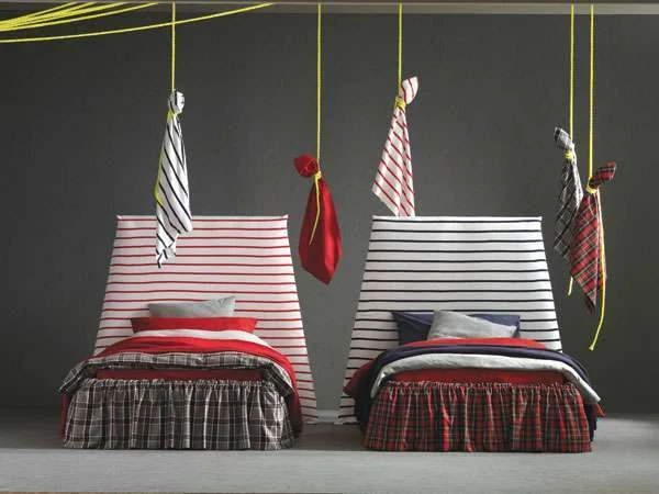 מיטה שעיצבה פאולה נבונה לחברת איבנו רדלי: שילוב של משחקי בדים ותצורות תפירה החל ממשענת גב גבוהה ומרופדת וכלה בחצאית חיננית העוטפת את הבסיס. "טולמנ'ס". מתוך "הארוג, הסרוג, והמרופד". גליון 123, מרץ - אפריל 2012