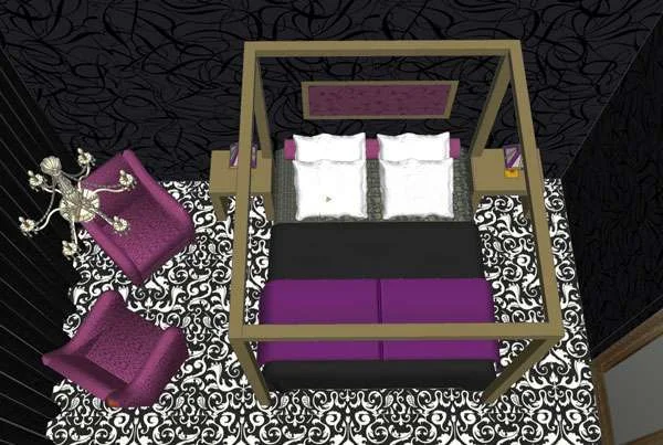 המיטה עטופה במעין מסגרת אפריון כמו מסגרת לתמונה שמדגישה ומכבדת את המיטה אך לא דרושים לה בדים נוספים. תמונת החדר מעל המיטה גם היא מסגרת זהובה ובתוכה טקסטורה של בד. על דלת הכניסה לחדר ניצבת מראה .