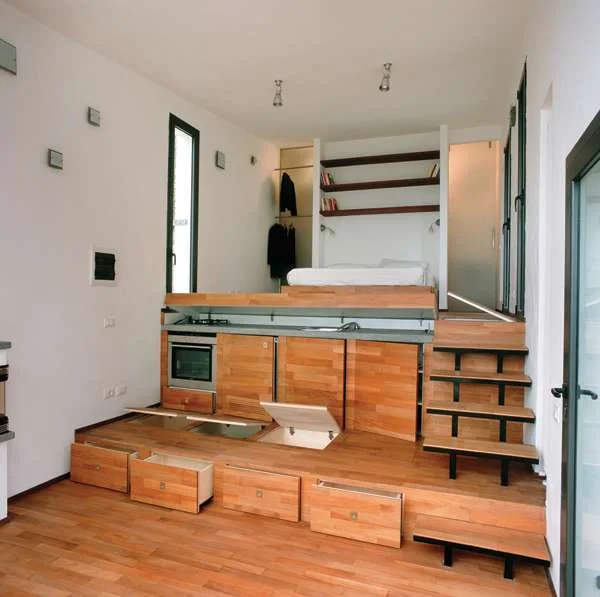 ניצול במיטבו: אלמנטים נסתרים וכאלה שמשחקים תפקיד כפול, דוגמת מגירות שהינן גם ספסל ישיבה, מכסה של אזור הבישול שמתרומם והופך למעין מעקה.-----