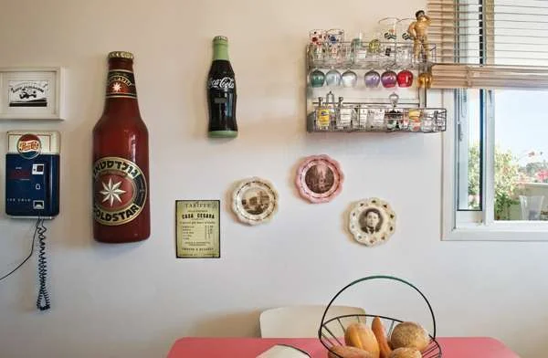 לצד הצבע, מככבים בבית אוספים, חפצים ואביזרים שבלקינד-שפס רוכשת בשווקי פשפשים בעיקר, בארץ ובעולם. "האביזרים האלה, שמייצגים במידה רבה את הזיקה לוינטג', הם הנשמה של העיצוב" היא אומרת, ונוכחותם הפזורה ברחבי הבית אכן חיננית ומלבבת: כוסות בירה עם תוויות לוגואים, צלחות ישנות, בקבוקי קוקה קולה ובירה גולדסטאר שתלויים על קיר המטבח ואינם אלא גופי תאורה, ועוד כהנה וכהנה פריטים ספוגי ארומה של ימים אחרים.