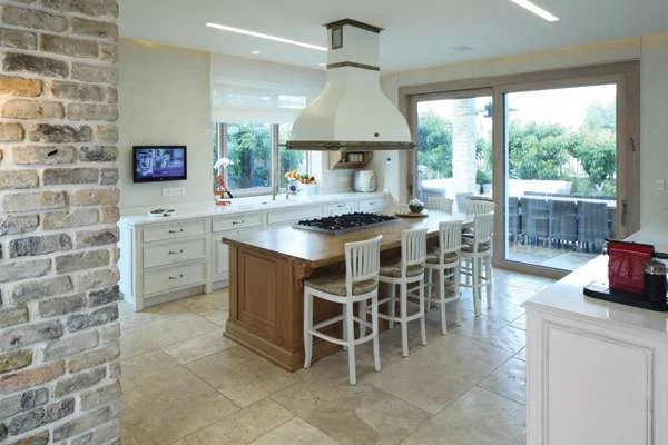 המטבח: חלל מרווח שבמרכזו יחידת אי גדולה עשויה עץ אלון עם משטח בוצ'ר בלוק ומשני עבריו מערכי יחידות תחתונות בגון שמנת. היחידה מאכלסת בתוכה תנור בעיצוב רטרו, מעליה מותקן קולט אדים בגון שמנת תואם"אופן חלוקת החלל " אומרת דן "מייצר הרבה זוויות מבט וקשרי עין ישירים, הן בין חוץ ופנים והן בין החללים השונים במרחבי הקומות, כאשר בתוך כך הוא משרת את אופייה החם של המשפחה, שקשרים אלה ותחושת ה"ביחד" חשובים לה מאד".