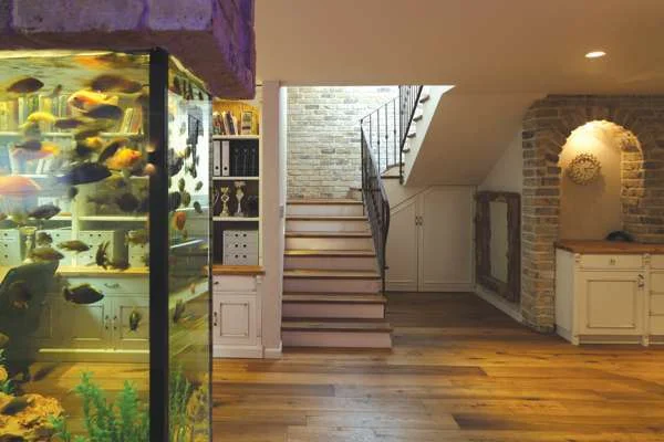בריכת השחייה עם מפל הזורם עליהם ישירות לתוכהקומת המרתף שהינה, כאמור, חלק בלתי נפרד מהתנהלות החיים בבית, אינה חורגת משפת העיצוב, הן בסגנונה והן בשימושי חומריה, ואלמנט מלבב שתוכנן בה הוא אקווריום עתיר דגי נוי צבעוניים המהווה תיחום/חציצה של חדר הקולנוע המעוצב כסלון ביתי נוסף.