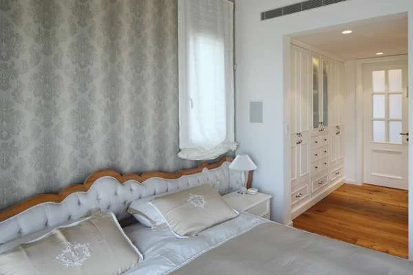 סוויטת ההורים: מרחב נוח מרוצף בפרקט ומקורה בתקרת עץ משופעת, ונחלק לאזורי שינה, ארונות/ הלבשה, ורחצה. העיצוב רומנטי ורך, משלב מיטה עם רגלי לואי ומשענת גב בריפוד קפיטונאז', שולחנות לילה תואמיםסוויטת ההורים רחבת הידיים, שממנה ישנה יציאה למרפסת הצופה היישר אל הבריכה שבגינה, מתוכננת כרצף אזורים המשווה לה תחושת מרחב לצד פונקציונאליות מיטבית: אזור שינה רך ורומנטי עם מיטה מהודרת בעלת משענת גב בריפוד קפיטונאז' ורגלי "לואי", אזור ארונות/הלבשה מרווח ומשופע במקומות אחסון, וחדר רחצה כמרחב המאחד פונקציונאליות ואסתטיקה. חללו נחלק לאזור "קדמי" בו ממוקמת יחידת הכיור, ולאזור רחצה/מקלחת הממוקם בעומק שטחו ומעוצב באורח מפנק במיוחד: מחופה באריחי אבן טרוונטין ומרוצף בסרגלי עץ טיק, שני עבריו מתוכננים כמקלחונים "ליחיד" ומרכזו כמקלחון זוגי עם ספסל בנוי, ג'טים שנקבעו בקיר וראש טוש ענק משולב בתאורת לד.