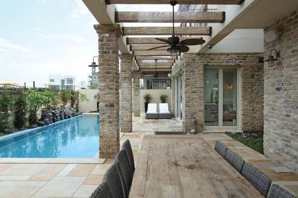 הקוהרנטיות הויזואלית המאפיינת את חלל הפנים גולשת גם אל הגינה האחורית, שבשטחה משתלבת בריכה הנצפית מכל פינה במרחב הבית, ויתרתו הינה רחבה מרוצפת כ"מיקס" של אבנים בעיבוד עתיק (טרוונטין וסוגים נוספים) במידות וגוונים שונים המייצרים תחושת גודל. בחלקה הסמוך ליציאה מהמטבח ניצבים שולחן אוכל נדיב ממדים, עמדת ברבקיו ופינת ישיבה, מוכנים ומזומנים לאירוח, וחלקה הסמוך לבריכה תחום בצמחייה ובסלעי בזלת גדולים עם מפל מים הזורם על פני שטחם ישירות לבריכה. לבני הפירוק המחפות את חלקו התחתון של המבנה משרות את נוכחותן החמימה גם כאן בחוץ, "קושרות" אותו עם חלל הפנים, והפתחים הגדולים החושפים אותו משלימים את תמונתה של חוויית מגורים נעימה, ספוגת ארומה חמימה.