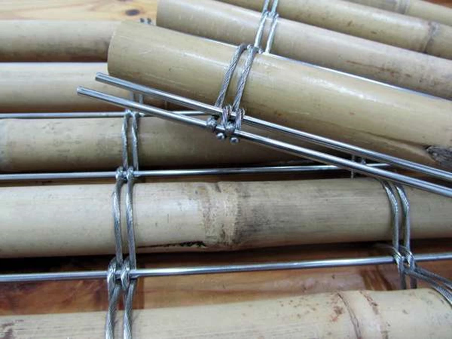 רשת המשלבת חוטים ומוטות מפלדת אל חלד בתוכם שזורים מוטות במבוק טבעיים