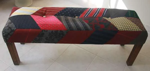 ספסל ישן ששוקם ורופד בבדי עניבות משי ישנות. 'אריאלה כסלו'.