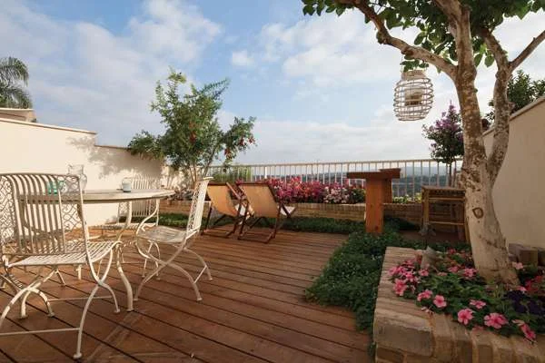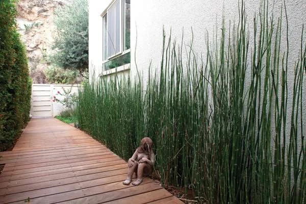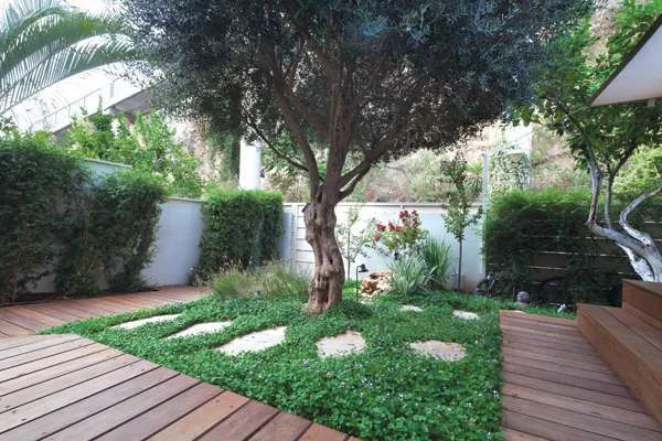הגינה הקדמית: מראה טבעי ואזור שהייה מוצל ונעים לכל בני הבית. באדנית נוספת, שתוכננה בצד ימין, ניטע עץ הדר שהשלים את מסגרת הגינה. משטח הישיבה רוצף, כאמור, בדק איפאה, אבל תוך שילוב טריק נוסף- הדק אינו מגיע עד האדניות, אלא "פותח" מעין פס הפרדה ירוק של כ-40 ס"מ ממנה, עם צמחיה משתרעת שנשתלה בו. כך נוצר מרחב משפחתי נוח ומרווח יחסית, שאכן מייצר המשך ישיר לסלון הבית, הן פיזית והן בשילוב החומרים.