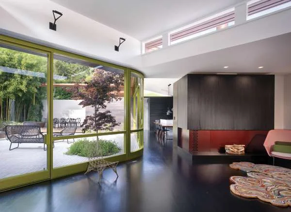 העתקת המטבח לקרבת הפאטיו והוספת פינת בישול ואכילה בגינה, יצרה חיבור מוצלח יותר בין הפנים לחוץ, כהמשך טבעי של חלל הפנים. הבית המקורי היה ממוקם על מגרש תלול, במרחק מה מהרחוב וגבוה ממנו. דים ידעה שהיא רוצה להתקדם מטה כלפי הרחוב ולא להתרחב כלפי מעלה, ואכן כעת נכנסים אליו דרך רחבה יפה, עם גינון מרשים ומקום חנייה רחב ידיים. דלת הכניסה היא בגובה מפלס הרחוב, ומולה ממוקם גרם מדרגות מרחף ומרשים - קונסטרוקציית פלדה ומדרכים עשויים עץ גושני צבוע שחור ש"יוצאים" מקיר עץ סידאר שחור גם כן. רצפת העץ המקורית (דובדבן ברזילאי) נצבעה אף היא בגוון שחור תואם משמאל ממוקם חדר הילדים רחב הידיים של הבן קאל, ומימין חדרה של אחותו התאומה מייסי.