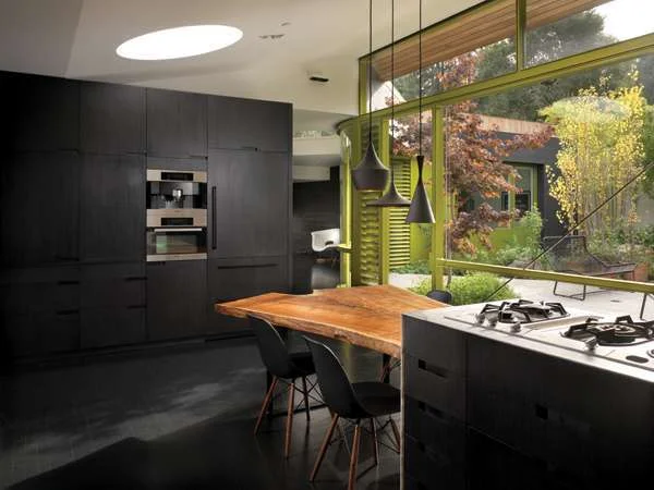 האי נחלק למשטח עבודה משיש קררה שבקצהו משתלב שולחן אכילה עשוי עץ אגוז גושני שנחטב מעץ שנפל על כביש בעמק הסיליקון. לארה העלתה את הרעיון הנועז לשנות לחלוטין את חלוקת החלל: להעביר את המטבח למקום שבו היה קודם חדר הילדים, ואת פינת המשפחה למקום בו היה המטבח הישן. הניסיון לימד שכמשפחה הם חיים בחצר האחורית, כך שהעברת המטבח לקרבת הפאטיו, והוספת פינת בישול ואכילה בגינה, יצרה חיבור מוצלח יותר בין הפנים לחוץ ואפשרה לראות את הגינה כהמשך הטבעי של חלל הפנים.