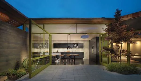 מאחר שכבר ניצלו עד מקסימום את שטח הבנייה המותר, לא יכלו להוסיף עליו, אך את השינוי הדרמאטי ותחושה של מרחב הגדול יותר השיגו באמצעות דלת אלומיניום ענקית הנעה על ציר וכשהיא פתוחה הפתיחות לגינה כמעט מושלמת. היות ומשקל הדלת קרוב לטון ויש לה יסודות מתחת לציר, מבחינה הנדסית צריך היה לתכנן את המפתח כך שעם פתיחתה היא לא תעתיק את כל הבניין ממיקומו. על מנת לרכך את המראה תכנן כריס לצידה קיר זכוכית מעוגל, ובחר בגוון אלומיניום ירוק בהיר כדי לשוות לו מראה יותר משוחרר ופחות מהונדס ומהוקצע.