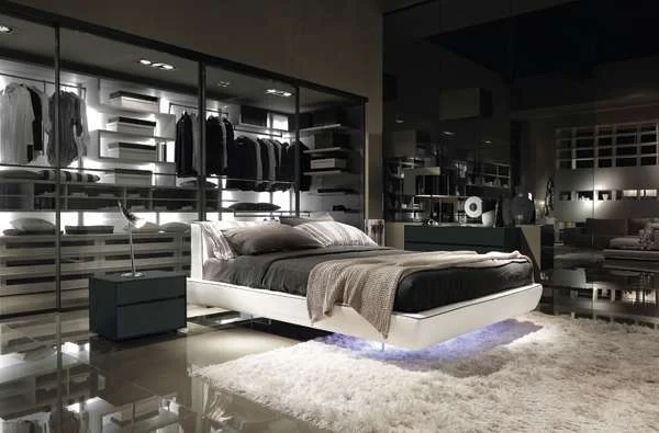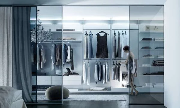 קולקציית 'Abacus' מבית 'Rimadsio', היוצרת 'הליכה' בתוך הארון ומשלבת חזיתות זכוכית דקה מצופה לכה. רשת 'טולמנ'ס' המלצות לתכנון חדר ארונות (באדיבות אדריכלית מיכל שיין)