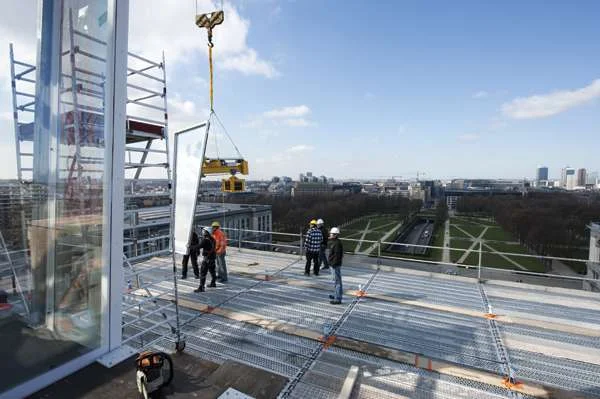 צוות הבנייה במהלך הקמת המסעדה התחנה הראשונה של המסעדה בה עסקינן הייתה בבריסל, על גגו של שער הניצחון בפארק צ'ינקוונטריה (Parc de Cinquantenaire ), שהינו מתחם רחב ידיים המאכלס את המוזיאון להיסטוריה צבאית, את המוזיאון למכוניות ואת המוזיאון המלכותי לאמנות של העיר. פארק זה מסמל את יובל ה-50 לעצמאותה של בלגיה בשנת 1880, והוא ניתן לזיהוי בקלות רבה בזכות קשת הניצחון הענקית ,מהגדולות מסוגה בעולם כולו.