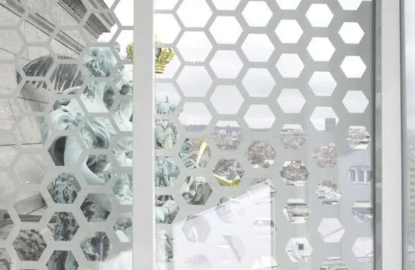 מעטפת המבנה עשויה מלוחות אלומיניום מחוררים באמצעות חיתוכי לייזר בתצורת משושים