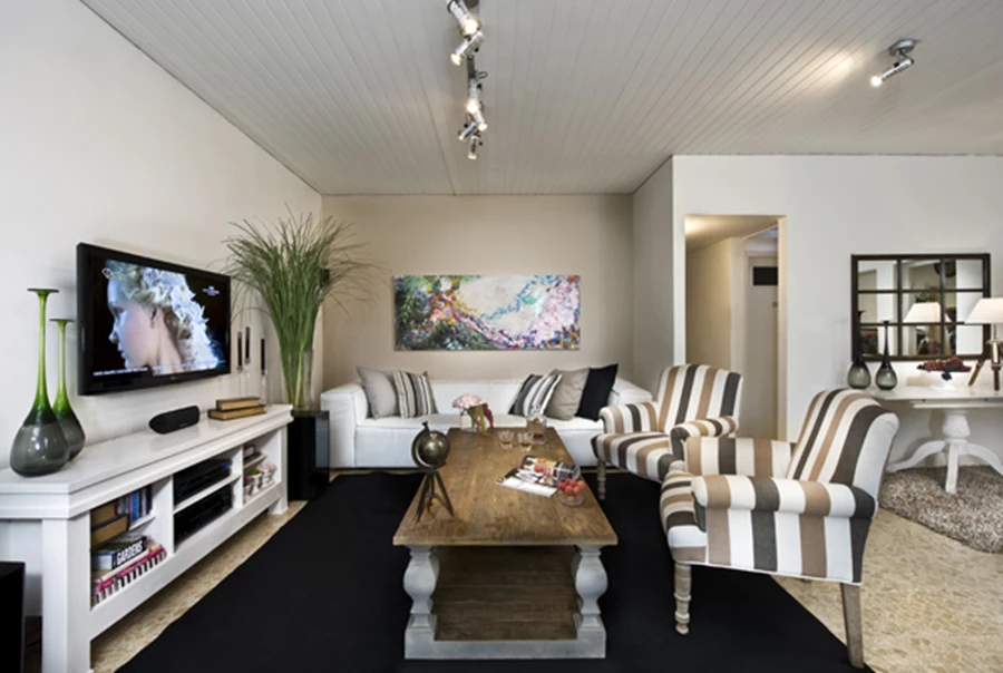 בתקרה לעומת זאת, נותר חיפוי העץ כשהיה במקור, אך צביעתו בגון לבן שיוותה לו חזות חדשה, ולצד תצורת הסרגלים של אופן התקנתו הוא משווה ערך מוסף של עניין ממעל. עיצוב הבית האקלקטי המאפיין את החלל מעיד על זיקה כלשהי לסגנון רטרו ולפריטי וינטאג' האהובים על חסון במיוחד, ומתקבל מפריטים שהוא מלקט בקפידה, אם בשווקי פשפשים בארץ ובעולם, ואם בחנויות "רגילות" בהן הוא מוצא את מבוקשו. גופי התאורה מאידך, הם דווקא גופים מודרניים יותר- ספוטים וצמודי קיר, והחיבור בין הסגנונות והפריטים השונים מתאחד לכדי זרימה טבעית והרמונית.