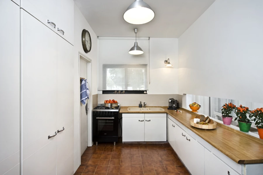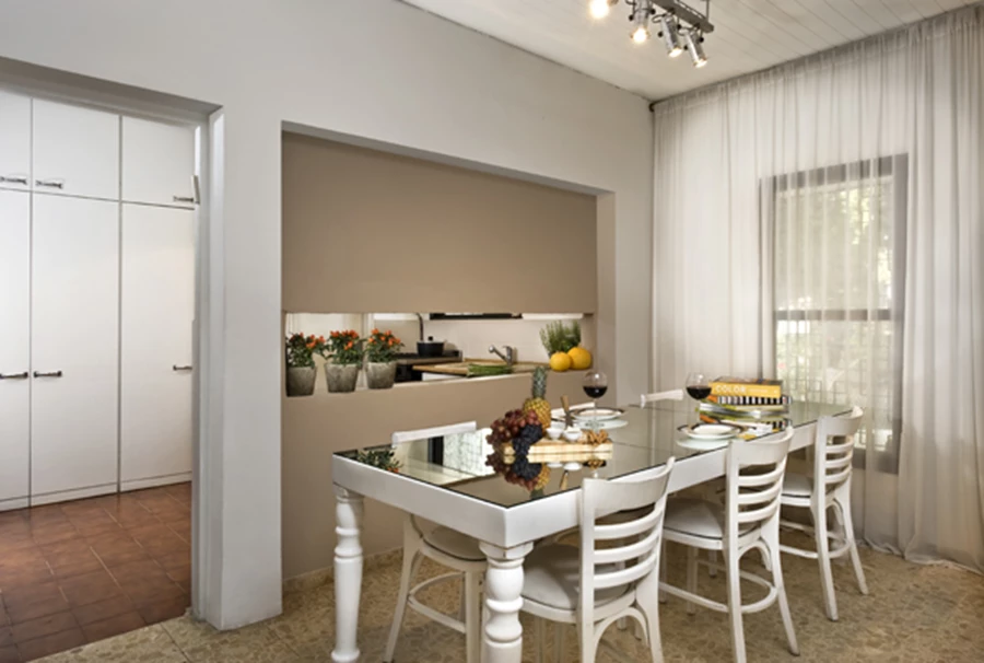 ברוח הזמן בו נבנה הבית המטבח הוא חלל סגור, אך על מנת לאוורר מעט את חזות המרחב כולו נפרץ בקיר ההפרדה בינו לבין פינת האוכל פתח אופקי היוצק ממד של עניין ופתיחות, ואף מאפשר קיום קשר עין עם יתרת אזורי החלל. בחלל המטבח עצמו הוחלף ריצוף ישן בריצוף אריחים מ קרמיקה בגון חום, ולמרות שחזיתות הארונות הן החזיתות המקוריות, אביזרי החשמל העכשוויים, הקפידה בבחירת הפריטים ששולבו בו והפתח האופקי שצופה ישירות אל פינת האוכל, מעדכנים את חזותו.