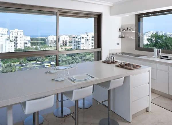 באותה רוח תוכנן גם המטבח כאזור נוח מאד, המשלב משטח עבודה עשוי קוריאן שנמשך מקיר לקיר, יחידת קיר גדולה משופעת במקומות אחסון עם חזיתות פורניר עץ משוחזר היוצק חמימות, ויחידת אי מרשימה בגודלה המשמשת הן לאחסון והן כדלפק אכילה וכמשטח עבודה נוסף. פינת הישיבה בסלון מגלמת את המינימליזם שנקט עיצוב הדירה מבחינת שילוב פריטי ריהוט שנבחרו בקפידה יתירה עם אפיל אמנותי כלשהו, ומוקד דומיננטי בחזותה היא מראה אדירת ממדים שנתלתה מעל הספה הארוכה -5 מ'- בסלון, כליווי מרשים שאף משקף את נוף הים.