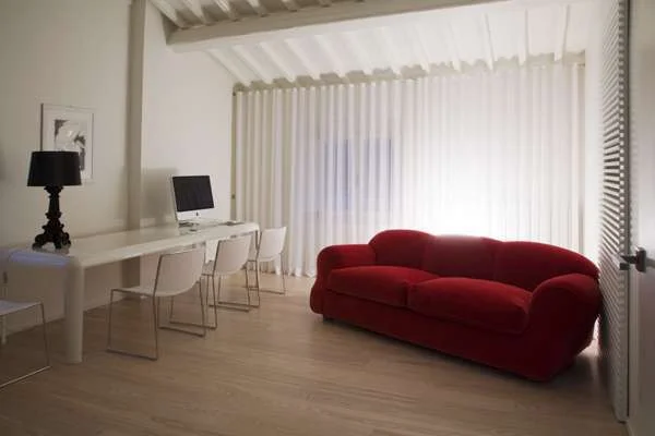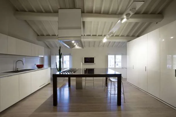 דירת גג בבית ישן בלוקה, טוסקנה, תוכננה ועוצבה מחדש, ובחזותה הנוכחית חושפת עיצוב פנים עכשווי, מינימליסטי ותיאטרלי כאחד