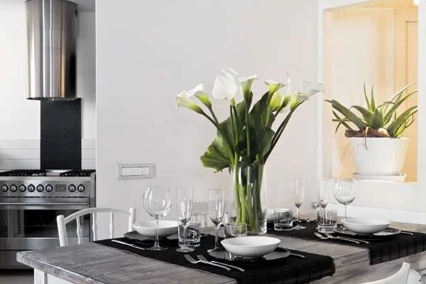 עיצוב פינת אוכל ומטבח- משחק של פינות, חומרים וגבהים, מגדיר היררכיה של אזורים: פינת האוכל והמטבח, ומחיצה אלכסונית המפרידה ביניהם. החללים השימושיים בדירה נותנים השראה של מרחב אחיד, אך עדיין מוגדרים על ידי משחק חכם של פינות, חומרים וגבהים המגדירים היררכיה של אזורים, כמו, למשל, המטבח הממוקם בקצה החלל מוצנע מאחורי שני קירות אלכסוניים, כאשר אחד מהם חובק נישה מאובזרת לשימושו, וכמו מאחוריו ניצבת פינת האוכל. הקונסטרוקציה ככלל, מתקבלת כסוג של מעטפת או אלמנט פיסולי הלוקח חלק במשחק שכבות, הנע בין חלול ומלא ומעניק אשליית תנועה גם באלמנטים נייחים. בהמשך לכך, גם כל הריהוט בדירה תוכנן על פי מידות בשטח, כשהוא מבוסס על רצון ליצור ממד דינאמי של תנועה. בתוך כך, הפריטים השונים מורכבים ממשטחי עץ שחורים ומצוידים בגלגלים המאפשרים לניידם, ובכלל זה שולחן הקפה ואף הספות הנוחות.