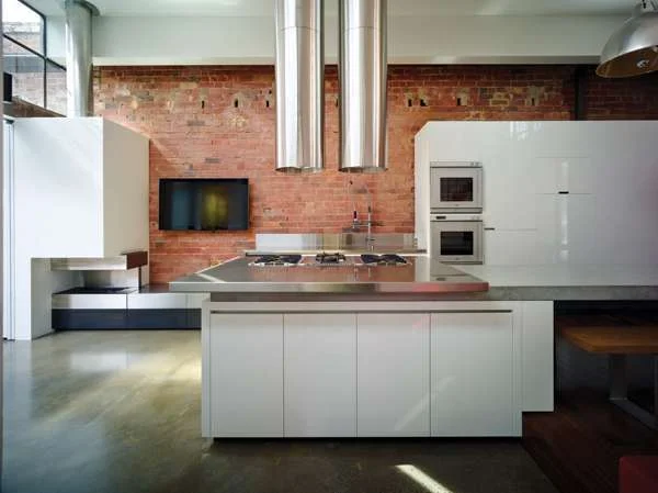 המטבח בחלל ההרחבה - מעוצב בהשראת לופט תעשייתי, ומשלב קולט אדים, משטח עבודה וגוף תאורה עשויים מנירוסטה .