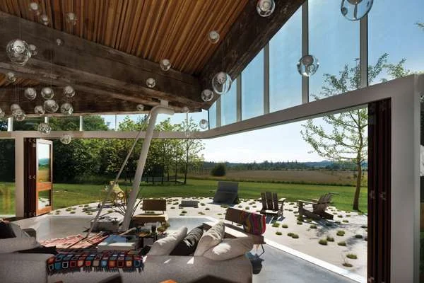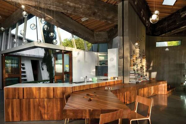 קורות ענק ישנות של עץ שנועדו להשתלב בבית שתכנן האדריכל עומר ארבל בעיירה הקנדית בקרבת ונקובר, חייבו אותו להתמודד עם מידותיהן הלא אחידות. פתרון גיאומטרי של תצורת משולש הניב מבנה מרתק ,שמקשה להבחין איפה עובר הגבול בינו לבין החוץ שסביבו