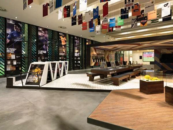 מצלעות התקרה, ובמרווחים שווים, תלויות חולצות מקופלות של כל קבוצות הכדורגל המובילות בעולם, תוך יצירת עיצוב ייחודי לתקרת החלל. על הקיר מותקנת עמדת תצוגה של פוסטרים עם פרסומות חברת נייקי מהעשורים האחרונים, וביניהם צילומים מרהיבים המתעדים רגעים נדירים של שחקני כדורגל מובילים, החל ממארדונה ועד רונלדיניו, ריבאלדו, מסי ועוד, ונישות עם מדפי עץ שמשתלבות בקירות מציגות ספרים ומוצרים מעולם הכדורגל. בקומה השלישית ממוקמים המשרדים של ההנהלה מהם ניתן לצפות אל קומת הכניסה, ובגג הנגיש לכולם ישנה גלריה ממנה ניתן לצפות אל המגרשים.