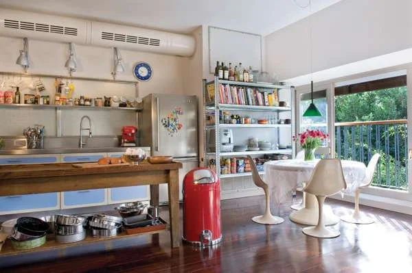 תוכנית הדירה לאחר השיפוץבקו מקביל ליחידה זו ניצב שולחן עץ ישן, שאף הבחירה בו היא תוצר של השראה, שבמקרה זה נשאבה מהסרט "ג'ולי וג'וליה" (מי שלא ראה- לא להחמיץ!). כאן במטבח הוא משמש כעין יחידת אי, כאשר משטחו הוא משטח עבודה/הנחה, ומדף תחתון שמשולב בו משמש כמקום אחסון לשלל סירים ותבניות המעידים על הפעילות הענפה שמתבצעת באזור זה של החלל. מקום אחסון נוסף מעניקה יחידת מדפי מתכת גבוהה המאכלסת לראווה כלים, מצרכי מזון, בקבוקי יין וספריה מכובדת של ספרי בישול, וכשהיא ניצבת בסמוך לפינת אוכל שעל עיצובה האייקוני חתום המעצב אירו סארינן, שוב בא לידי ביטוי חיבור העולמות המייחד כל פינה בחלל.