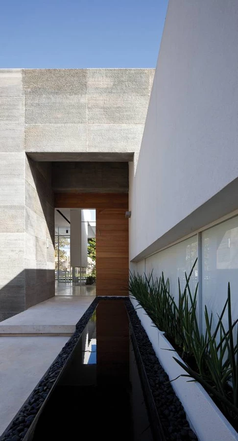 מבט מהגן המשתרע בחזית האחורית אל עבר בריכת השיקוף ודלת הכניסה: קונספט רעיוני הנשען על ציר אורכי הכולל פטיו עם בריכת שיקוף, אשר למרות היותם חיצוניים מהווים חלק בלתי נפרד מחלל הפנים.