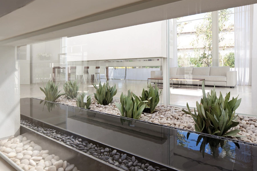מבט מדלת הכניסה אל מרחב החלל: מארג נקי וקוהרנטי, וציר הבריכה מייצר שני אזורים הממוקמים משני עבריה. ריצוף בטון מוחלק בגון "שמנתי" כלשהו, תעלות תאורה שקועות בתקרה, פרופיל בלגי לבן בויטרינות ובדלתות הפנים ומקצב מרתק של פתחים המייצרים מבטים משתנים ומפתיעים.משמאל: תקריב של בריכת השיקוף התחומה בחלוקי נחל שבינות להם ב"מערך מסודר" שתולים צמחי קקטוס.