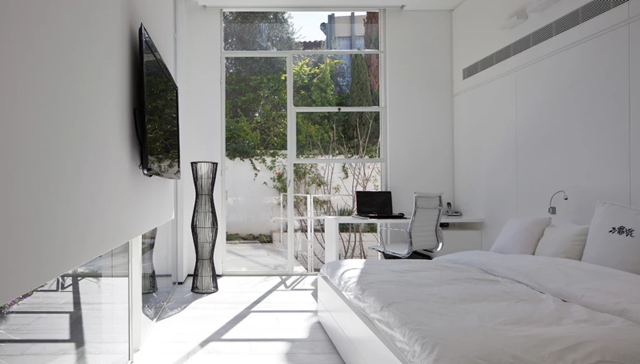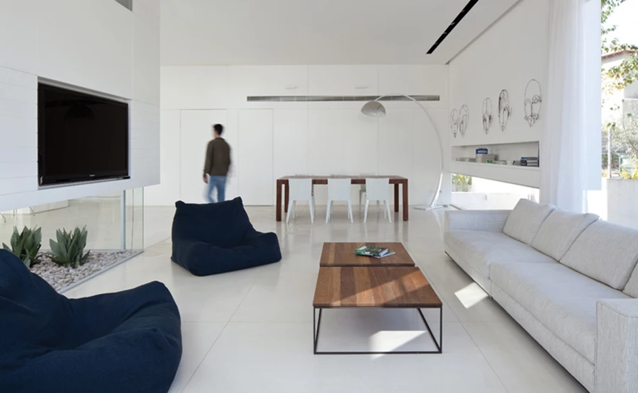 חלל הסלון: חובר לרחבת ישיבה חיצונית ומזמן הנאה ישירה וממוקדת מנופה של בריכת השיקוף. פתחי הסרט הנמוכים התקבלו הודות לתכנון קונסטרוקציה תלויה הנסמכת על קורות עליונות ועמודי ברזל במערכת החלונות, כך שהקירות האטומים נראים כתלויים ומרחפים באוויר, ללא כל תמיכה נראית לעין.
