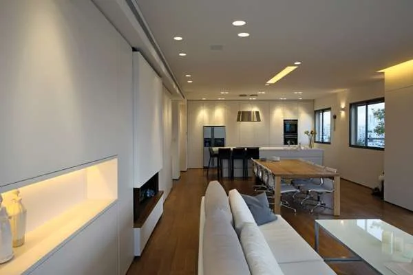 הקיר מאחורי המיטה חופה בטיח ותאורה סמויה שהותקנה במרווח בינו לבין משענת הגב שלה ממסגרת אותה לעת ערב בהילת אור רכה."למעשה, כל מה שניתן היה להצניע, אכן הוצנע, כדי לייצר חלל נקי ולפנות מקום לנוף" אומרת בן יעקב, שלמטרה זו הטמיעה את ארגזי התריסים בתוך פרטי גבס ואף אטמה חלק מפתח חלון להתקנת מסך הפלסמה, כך שגם בשעת צפייה בו הישיבה היא לכיוון הנוף וניתן ליהנות מנוכחותו הנחשפת מבעד לפתחים הסמוכים. אף תאורת החלל נשענת על הצנעה,ומתקבלת מגופים שקועים בתקרה, בריצוף, או מכאלה שהותקנו מאחורי ובתוך יחידות נגרות תוך יצירת אפקטים רכים ומפתיעים, והאלמנט התלוי היחיד הוא קולט אדים משולב עם גוף תאורה שמשתלשל מעל יחידת האי באזור המטבח.