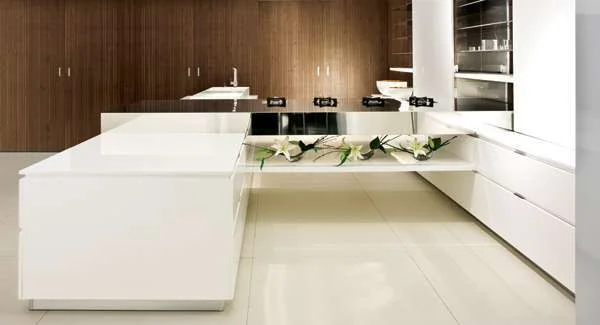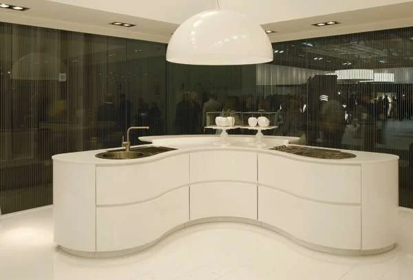 מטבח בעיצוב גלי, הכולל משטח, בייצור עצמי, מחומר אקרילי. 'אופוס פלוס סחר בינלאומי בע"מ'.